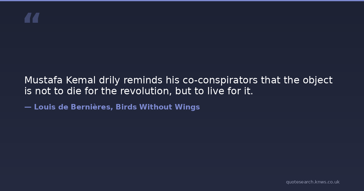 Mustafa Kemal drily reminds his co-conspirators that the object is not to die for the revolution, but to live for it. revolution Download Image Share on X Share on Facebook Copy Link