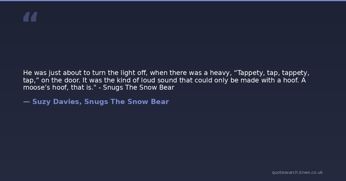 He was just about to turn the light off, when there was a heavy, “Tappety, tap, tappety, tap,” on the door. It was the kind of loud sound that could only be made with a hoof. A moose’s hoof, that is." - Snugs The Snow Bear