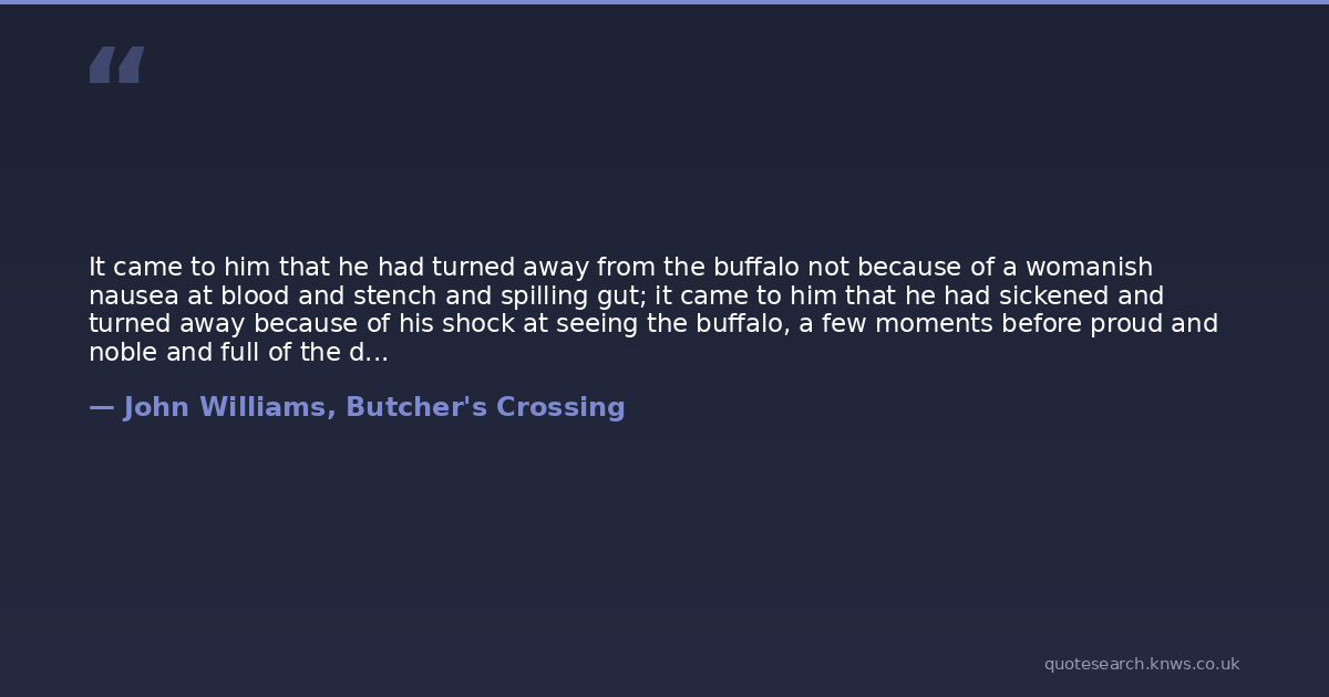 It came to him that he had turned away from the buffalo not because of a womanish nausea at blood and stench and spilling gut; it came to him that he had sickened and turned away because of his shock at seeing the buffalo, a few moments before proud and noble and full of the dignity of life, now stark and helpless, a length of inert meat, divested of itself, or his notion of its self, swinging grotesquely, mockingly, before him. It was not itself; or it was not that self that he had imagined it to be. That self was murdered; and in that murder he had felt the destruction of something within him, and he had not been able to face it. So he had turned away.