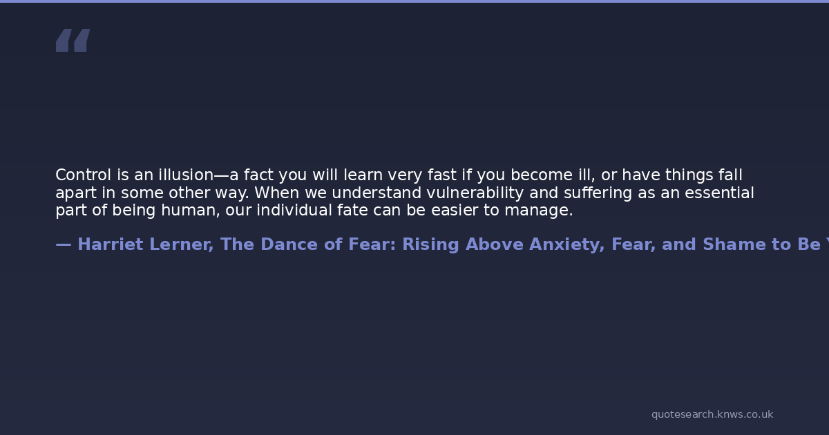 Control is an illusion—a fact you will learn very fast if you become ill, or have things fall apart in some other way. When we understand vulnerability and suffering as an essential part of being human, our individual fate can be easier to manage.