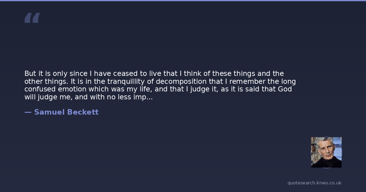 But it is only since I have ceased to live that I think of these things and the other things. It is in the tranquillity of decomposition that I remember the long confused emotion which was my life, and that I judge it, as it is said that God will judge me, and with no less impertinence. To decompose is to live too, I know, I know, don't torment me, but one sometimes forgets.