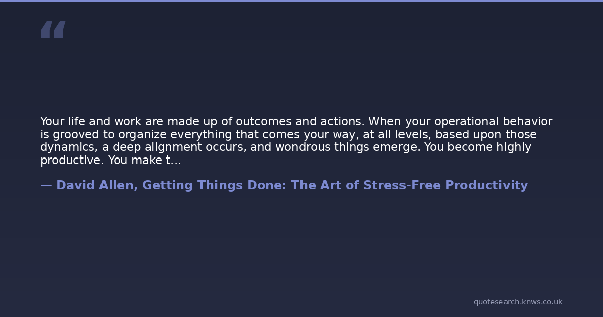 Your life and work are made up of outcomes and actions. When your operational behavior is grooved to organize everything that comes your way, at all levels, based upon those dynamics, a deep alignment occurs, and wondrous things emerge. You become highly productive. You make things up, and you make them happen.