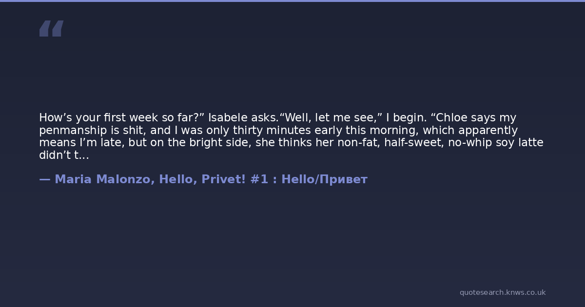 How’s your first week so far?” Isabele asks.“Well, let me see,” I begin. “Chloe says my penmanship is shit, and I was only thirty minutes early this morning, which apparently means I’m late, but on the bright side, she thinks her non-fat, half-sweet, no-whip soy latte didn’t taste right and then she told me she’s not paying for it. Other than that, work is just fine.