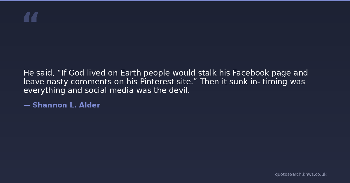 He said, “If God lived on Earth people would stalk his Facebook page and leave nasty comments on his Pinterest site.” Then it sunk in- timing was everything and social media was the devil.