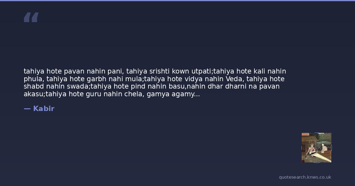 tahiya hote pavan nahin pani, tahiya srishti kown utpati;tahiya hote kali nahin phula, tahiya hote garbh nahi mula;tahiya hote vidya nahin Veda, tahiya hote shabd nahin swada;tahiya hote pind nahin basu,nahin dhar dharni na pavan akasu;tahiya hote guru nahin chela, gamya agamya na panth duhela.Sakhi: avigati ki gati ka kahown, jake gawn na thawngun bihuna pekhana, ka kahi lijai nawnIn that state there is no air or water, and no creation or creator; There is no bud or flower, and no fetus or semen; There is no education or Vedas, and no word or taste; There is no body or settlement, and no earth, air or space; There is no guru or disciple, and no easy or difficult path.Sakhi: That state is very strange. I cannot explain it. It has no village or resting place. That state is without gunas (qualities). What name can on give it?