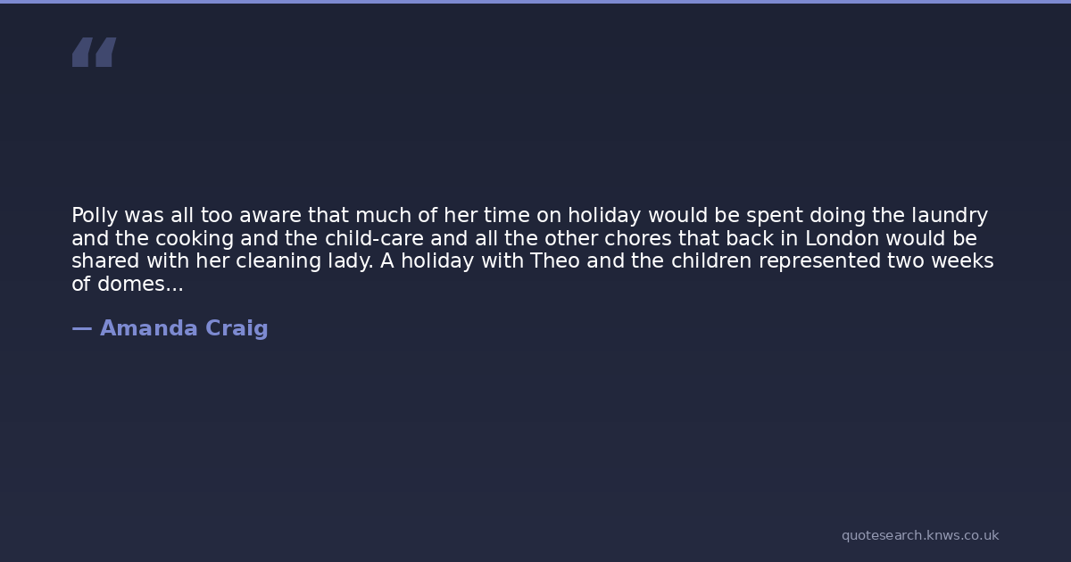 Polly was all too aware that much of her time on holiday would be spent doing the laundry and the cooking and the child-care and all the other chores that back in London would be shared with her cleaning lady. A holiday with Theo and the children represented two weeks of domestic and maternal drudgery.