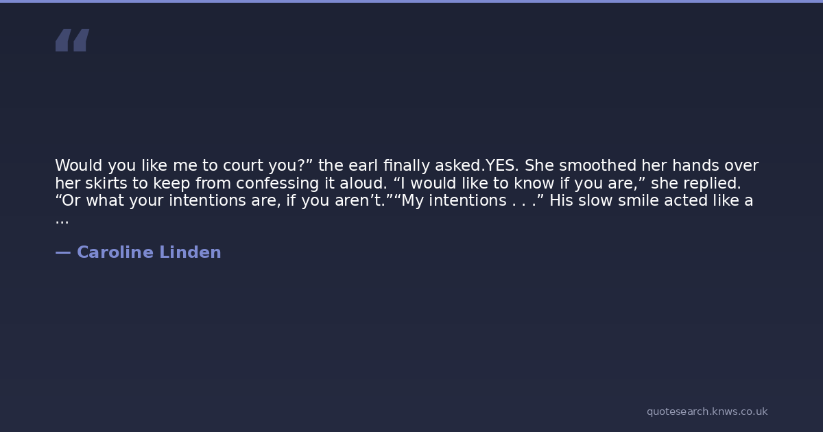Would you like me to court you?” the earl finally asked.YES. She smoothed her hands over her skirts to keep from confessing it aloud. “I would like to know if you are,” she replied. “Or what your intentions are, if you aren’t.”“My intentions . . .” His slow smile acted like a torch held to her skin. She felt prickly with heat and yet transfixed by the glowing allure of it. “I intend to have you, Maggie, in every way a man can have a woman. I want your hand in mine while we dance. I want you laughing beside me in the theater. I want you lying naked in my arms at night. And I want you standing beside me in church, saying ‘I will.’