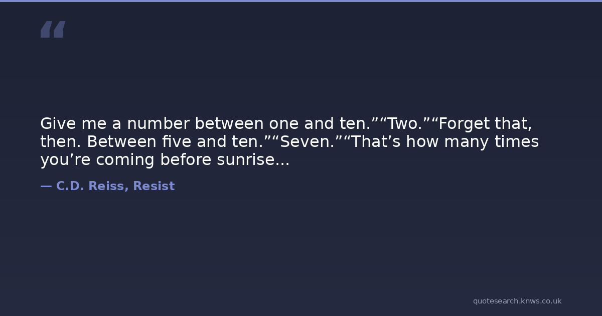 Give me a number between one and ten.”“Two.”“Forget that, then. Between five and ten.”“Seven.”“That’s how many times you’re coming before sunrise...