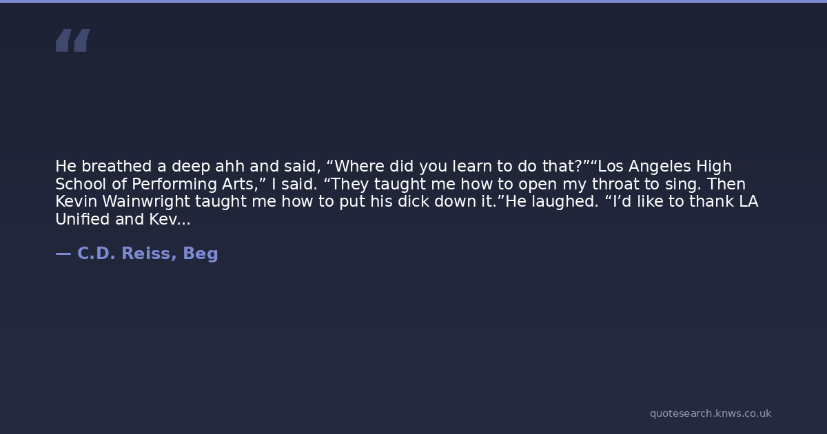 He breathed a deep ahh and said, “Where did you learn to do that?”“Los Angeles High School of Performing Arts,” I said. “They taught me how to open my throat to sing. Then Kevin Wainwright taught me how to put his dick down it.”He laughed. “I’d like to thank LA Unified and Kevin Whatever for this moment.