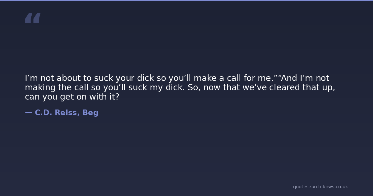 I’m not about to suck your dick so you’ll make a call for me.”“And I’m not making the call so you’ll suck my dick. So, now that we've cleared that up, can you get on with it?