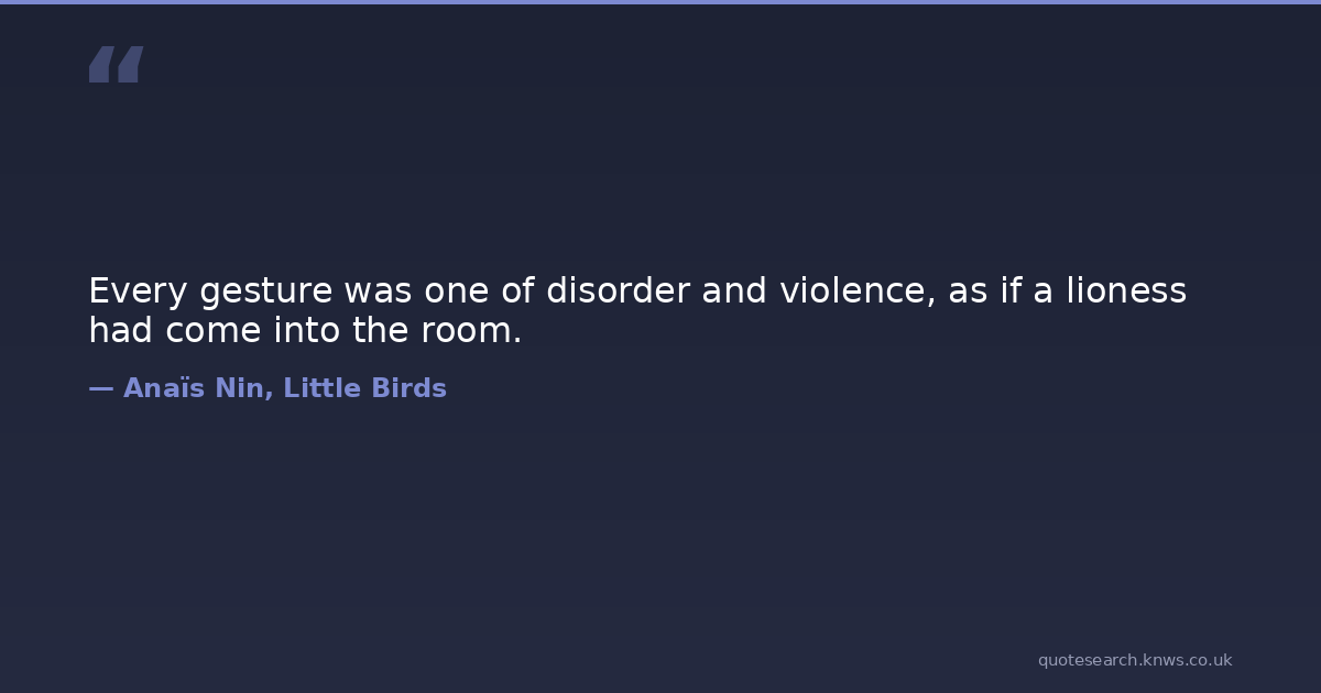 Every gesture was one of disorder and violence, as if a lioness had come into the room. anaïs-nin disorder erotica femme gesture lioness Download Image Share on X Share on Facebook Copy Link