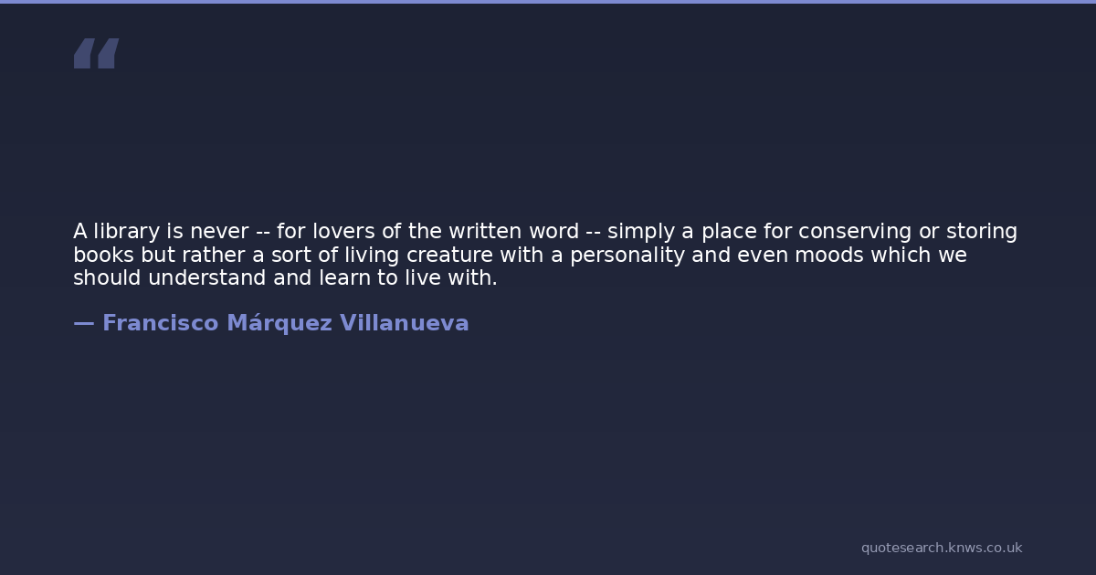 A library is never -- for lovers of the written word -- simply a place for conserving or storing books but rather a sort of living creature with a personality and even moods which we should understand and learn to live with.