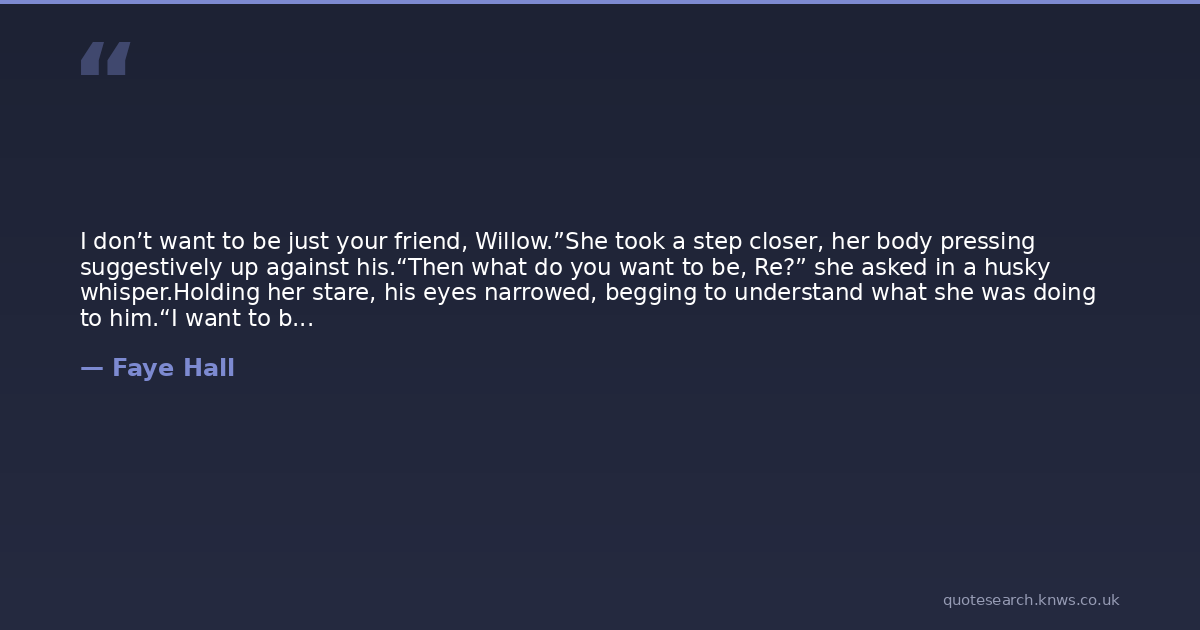 I don’t want to be just your friend, Willow.”She took a step closer, her body pressing suggestively up against his.“Then what do you want to be, Re?” she asked in a husky whisper.Holding her stare, his eyes narrowed, begging to understand what she was doing to him.“I want to be your lover.”“Such things you do say, sir,” she said playfully, trying to pull away from his firm grasp.Re’s fingers tightened around her wrists. Never before had a woman refused him, not even through all the games they played with him. That this one was daring to do so, both angered and hurt him.