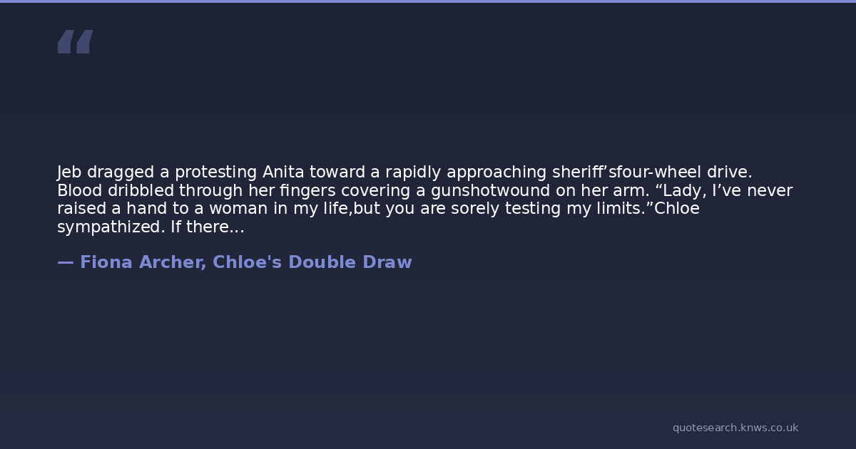 Jeb dragged a protesting Anita toward a rapidly approaching sheriff’sfour-wheel drive. Blood dribbled through her fingers covering a gunshotwound on her arm. “Lady, I’ve never raised a hand to a woman in my life,but you are sorely testing my limits.”Chloe sympathized. If there was one thing she hated it was acondescending psycho bitch with bad taste in sweaters.