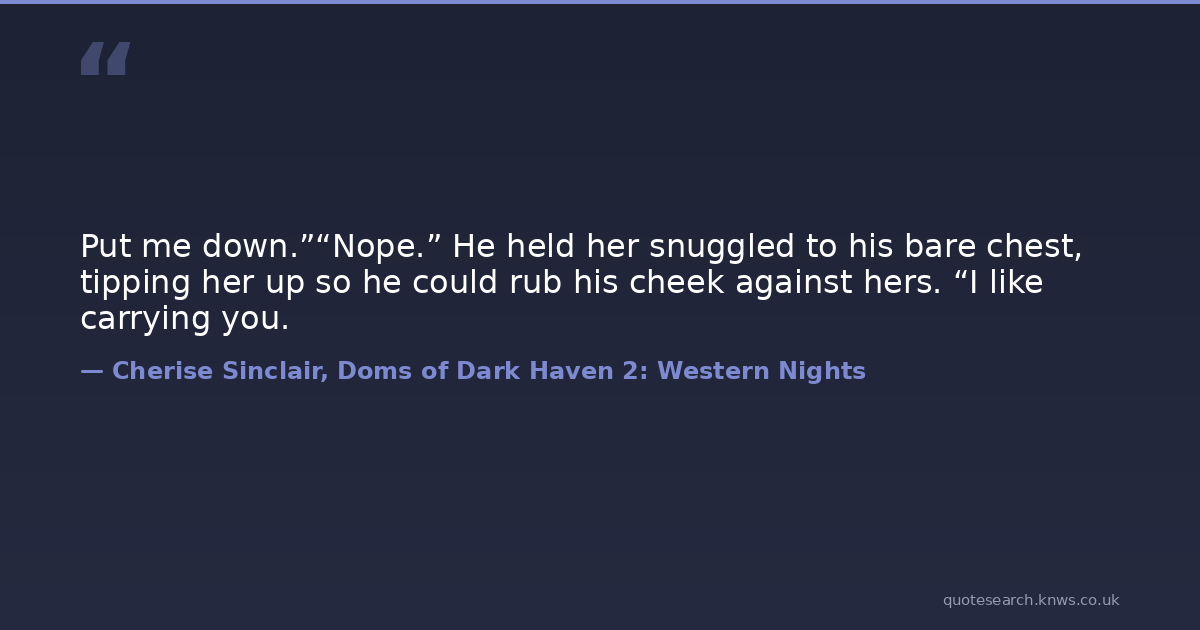 Put me down.”“Nope.” He held her snuggled to his bare chest, tipping her up so he could rub his cheek against hers. “I like carrying you.