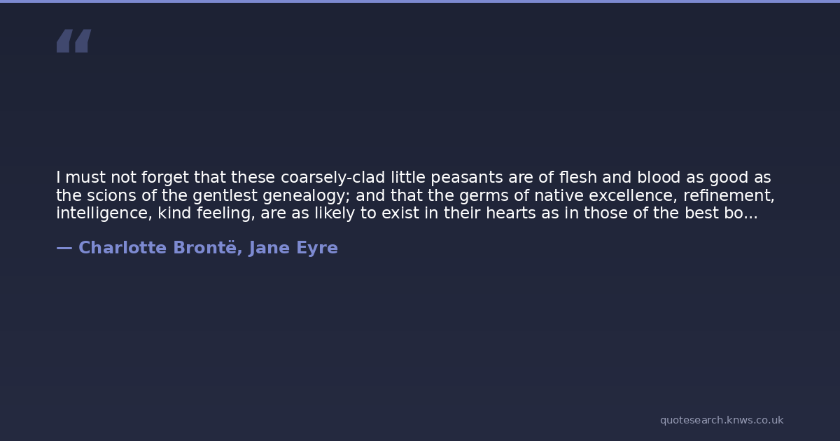 I must not forget that these coarsely-clad little peasants are of flesh and blood as good as the scions of the gentlest genealogy; and that the germs of native excellence, refinement, intelligence, kind feeling, are as likely to exist in their hearts as in those of the best born. My duty will be to develop these germs: surely I shall find some happiness in discharging that office.