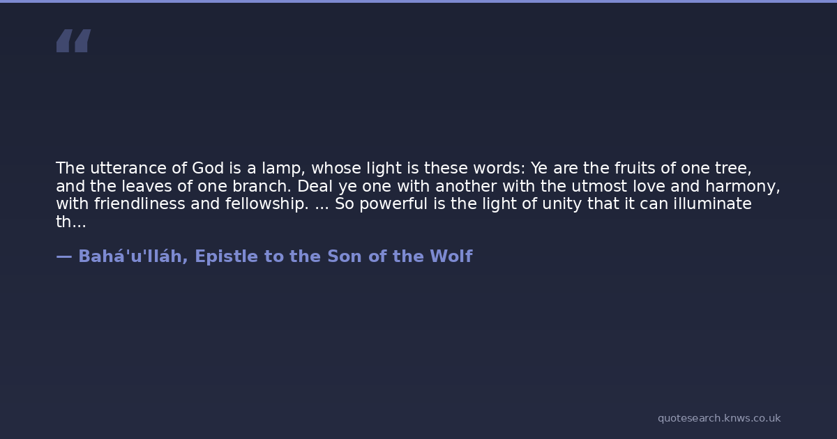 The utterance of God is a lamp, whose light is these words: Ye are the fruits of one tree, and the leaves of one branch. Deal ye one with another with the utmost love and harmony, with friendliness and fellowship. ... So powerful is the light of unity that it can illuminate the whole earth.