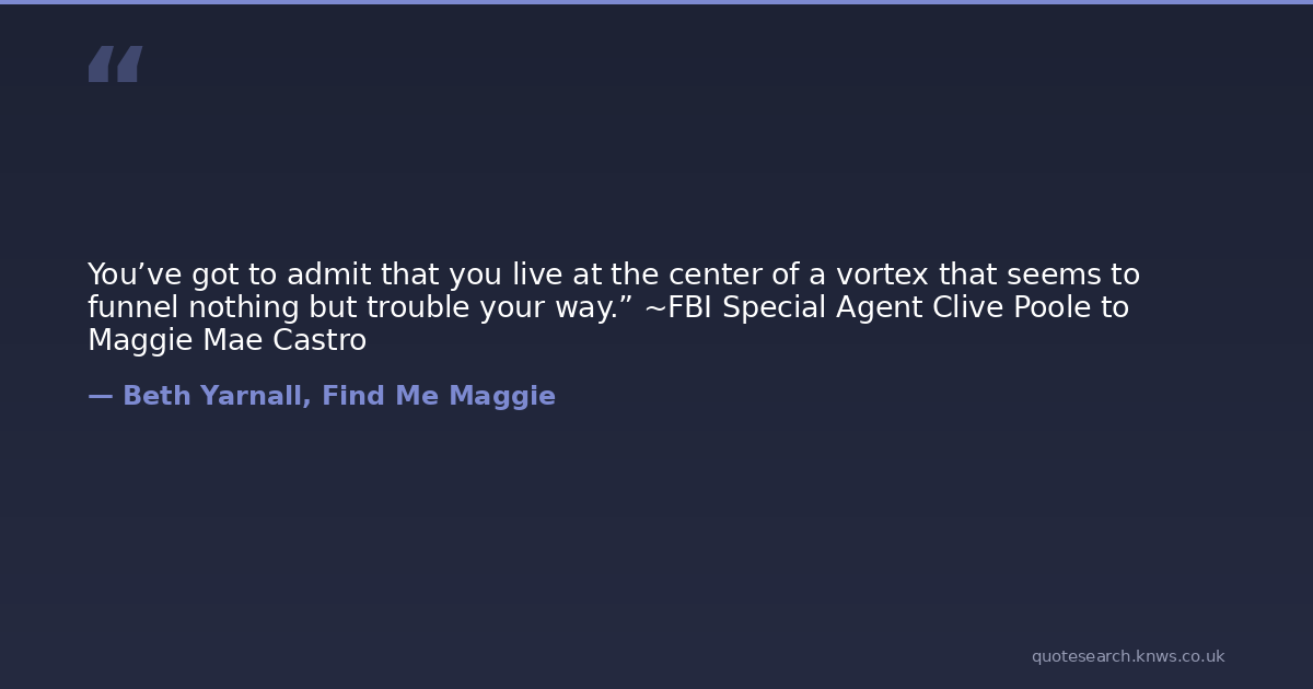 You’ve got to admit that you live at the center of a vortex that seems to funnel nothing but trouble your way.” ~FBI Special Agent Clive Poole to Maggie Mae Castro