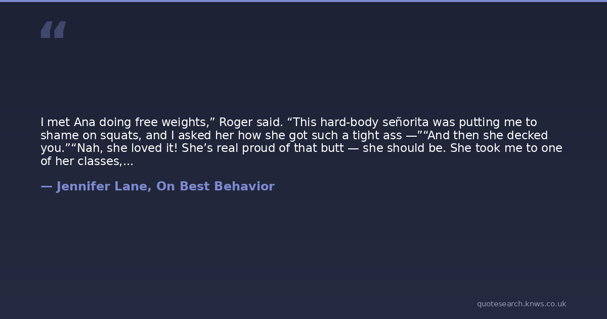 I met Ana doing free weights,” Roger said. “This hard-body señorita was putting me to shame on squats, and I asked her how she got such a tight ass —”“And then she decked you.”“Nah, she loved it! She’s real proud of that butt — she should be. She took me to one of her classes, and I got hooked. She’s a Zumba instructor.”Grant absorbed that information for a moment. “You do...Zumba?”“It’s great! Much more fun than PT. You just get going...” He did a little two-step maneuver on the city street, dancing to an unknown Latin beat. “Cha cha cha. Heeuh? Ana does this a little better than me...”Grant tried to hold it in. He really did. But his body quivered, his shoulders shook, and soon a whooping laugh erupted — which lasted quite a few seconds.Roger abruptly stopped his dance. “You judge, Madsen. Not cool.