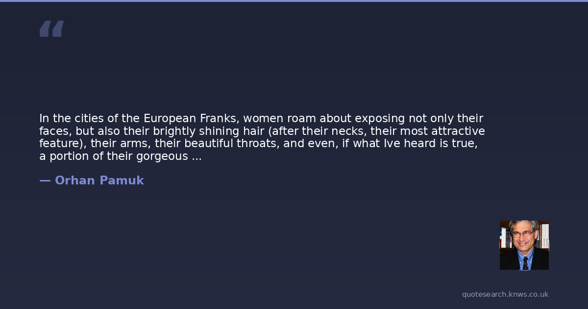 In the cities of the European Franks, women roam about exposing not only their faces, but also their brightly shining hair (after their necks, their most attractive feature), their arms, their beautiful throats, and even, if what Ive heard is true, a portion of their gorgeous legs; as a result, the men of those cities walk about with great difficulty, embarrassed and in extreme pain, because, you see, their front sides are always erect and this fact naturally leads to the paralysis of their society. Undoubtedly, this is why each day the Frank infidel surrenders another fortress to us Ottomans.