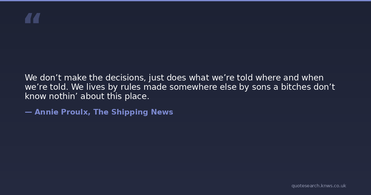 We don’t make the decisions, just does what we’re told where and when we’re told. We lives by rules made somewhere else by sons a bitches don’t know nothin’ about this place.