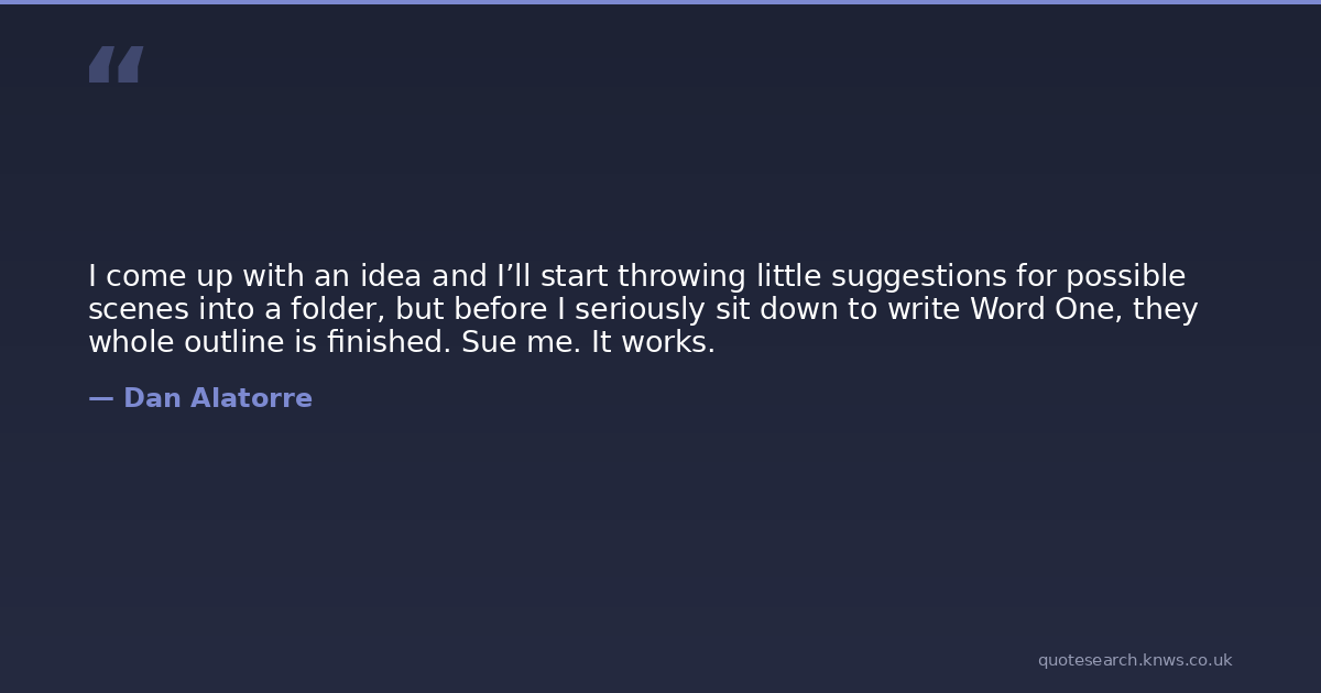 I come up with an idea and I’ll start throwing little suggestions for possible scenes into a folder, but before I seriously sit down to write Word One, they whole outline is finished. Sue me. It works.