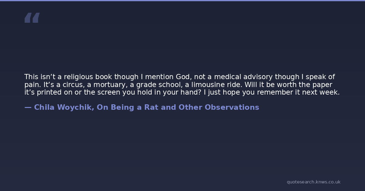 This isn’t a religious book though I mention God, not a medical advisory though I speak of pain. It’s a circus, a mortuary, a grade school, a limousine ride. Will it be worth the paper it’s printed on or the screen you hold in your hand? I just hope you remember it next week.