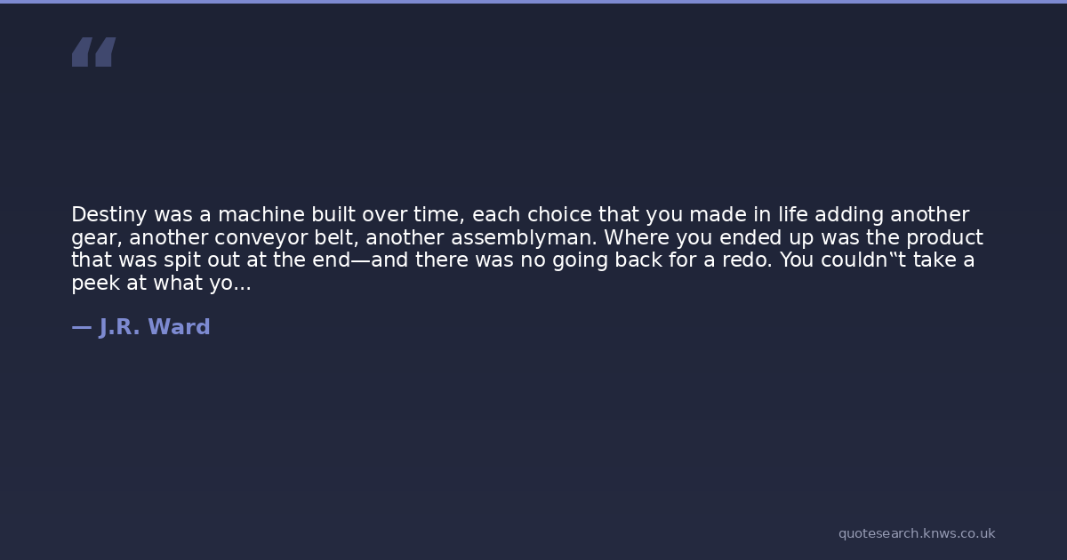 Destiny was a machine built over time, each choice that you made in life adding another gear, another conveyor belt, another assemblyman. Where you ended up was the product that was spit out at the end—and there was no going back for a redo. You couldn‟t take a peek at what you‟d manufactured and decide, Oh, wait, I wanted to make sewing machines instead of machine guns; let me go back to the beginning and start again. One shot. That was all you got.