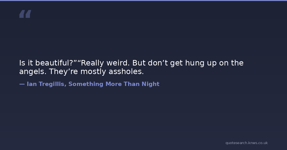 Is it beautiful?”“Really weird. But don’t get hung up on the angels. They’re mostly assholes. angels Download Image Share on X Share on Facebook Copy Link