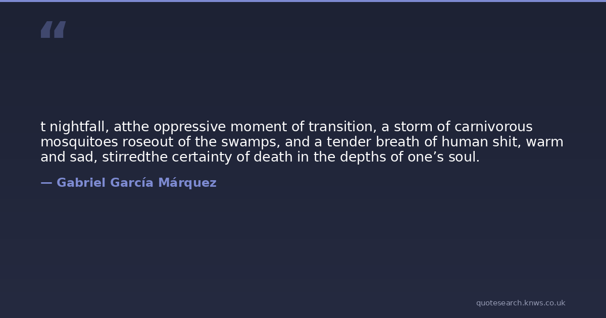 t nightfall, atthe oppressive moment of transition, a storm of carnivorous mosquitoes roseout of the swamps, and a tender breath of human shit, warm and sad, stirredthe certainty of death in the depths of one’s soul.