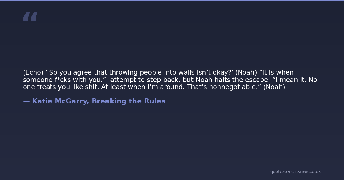 (Echo) “So you agree that throwing people into walls isn’t okay?”(Noah) “It is when someone f*cks with you.”I attempt to step back, but Noah halts the escape. “I mean it. No one treats you like shit. At least when I’m around. That’s nonnegotiable.” (Noah)