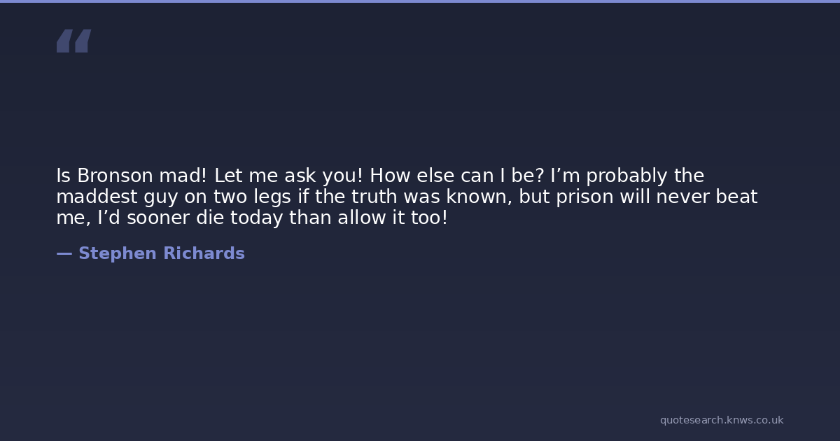 Is Bronson mad! Let me ask you! How else can I be? I’m probably the maddest guy on two legs if the truth was known, but prison will never beat me, I’d sooner die today than allow it too!