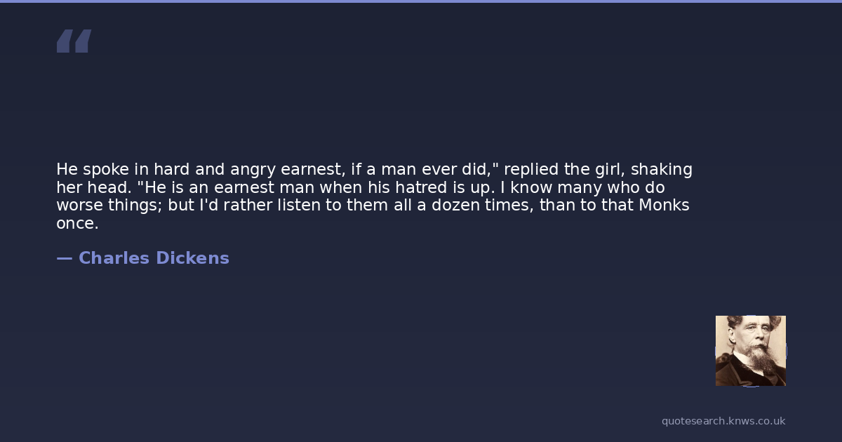 He spoke in hard and angry earnest, if a man ever did," replied the girl, shaking her head. "He is an earnest man when his hatred is up. I know many who do worse things; but I'd rather listen to them all a dozen times, than to that Monks once.