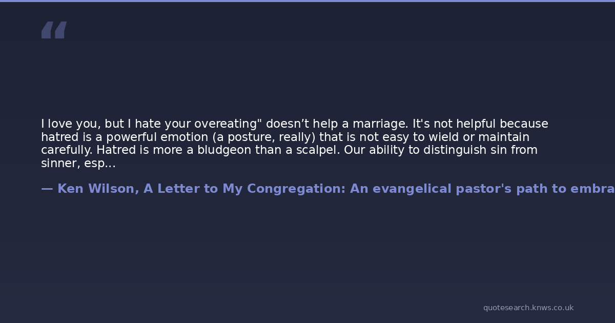 I love you, but I hate your overeating" doesn’t help a marriage. It's not helpful because hatred is a powerful emotion (a posture, really) that is not easy to wield or maintain carefully. Hatred is more a bludgeon than a scalpel. Our ability to distinguish sin from sinner, especially in others, is so limited, so vulnerable to our own unexamined subjectivity.
