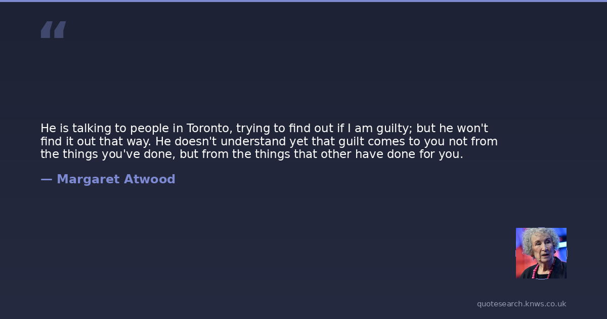 He is talking to people in Toronto, trying to find out if I am guilty; but he won't find it out that way. He doesn't understand yet that guilt comes to you not from the things you've done, but from the things that other have done for you.