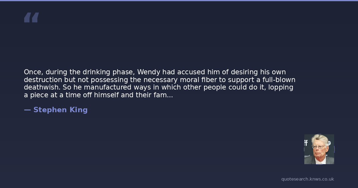 Once, during the drinking phase, Wendy had accused him of desiring his own destruction but not possessing the necessary moral fiber to support a full-blown deathwish. So he manufactured ways in which other people could do it, lopping a piece at a time off himself and their family.