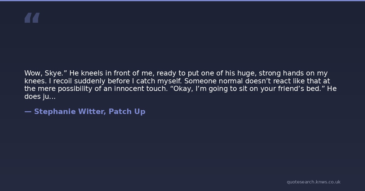 Wow, Skye.” He kneels in front of me, ready to put one of his huge, strong hands on my knees. I recoil suddenly before I catch myself. Someone normal doesn’t react like that at the mere possibility of an innocent touch. “Okay, I’m going to sit on your friend’s bed.” He does just that, his eyes locked with mine. I have the sense I’m trapped and I don’t like it. I don’t want to ever feel like that again. “You should go,” I say, my voice wavering and barely above a whisper.He takes a sip of his coffee absentmindedly, his eyes never leaving my face. I don’t drink mine. I don’t even feel the mug between my hands. I feel nothing besides the hammering of my heart in my chest. I’m having difficulty breathing, and my forehead and neck are sweaty under my hair.“Can I say something before I go?” he asks me in a voice calmer than he must feel if I take into account his clenched fist and the shaking of his hand holding the mug of coffee. I just nod, not sure I’m able to mutter a word through the lump in my throat. “I’m not the enemy. I’m not the kind of guy who would try to hurt you more when I know you’re already hurting, but I’m someone willing to hear you and understand you. I want to be able to help.