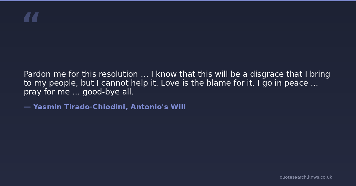 Pardon me for this resolution … I know that this will be a disgrace that I bring to my people, but I cannot help it. Love is the blame for it. I go in peace ... pray for me ... good-bye all.