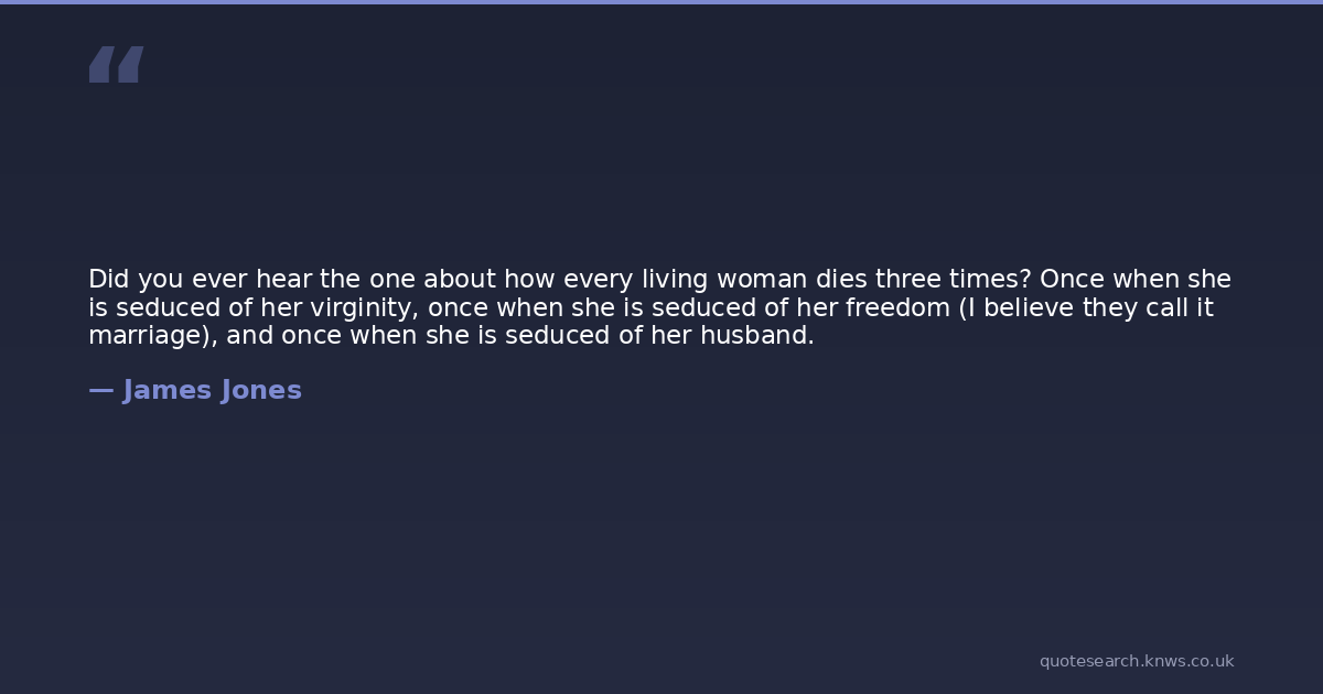 Did you ever hear the one about how every living woman dies three times? Once when she is seduced of her virginity, once when she is seduced of her freedom (I believe they call it marriage), and once when she is seduced of her husband.