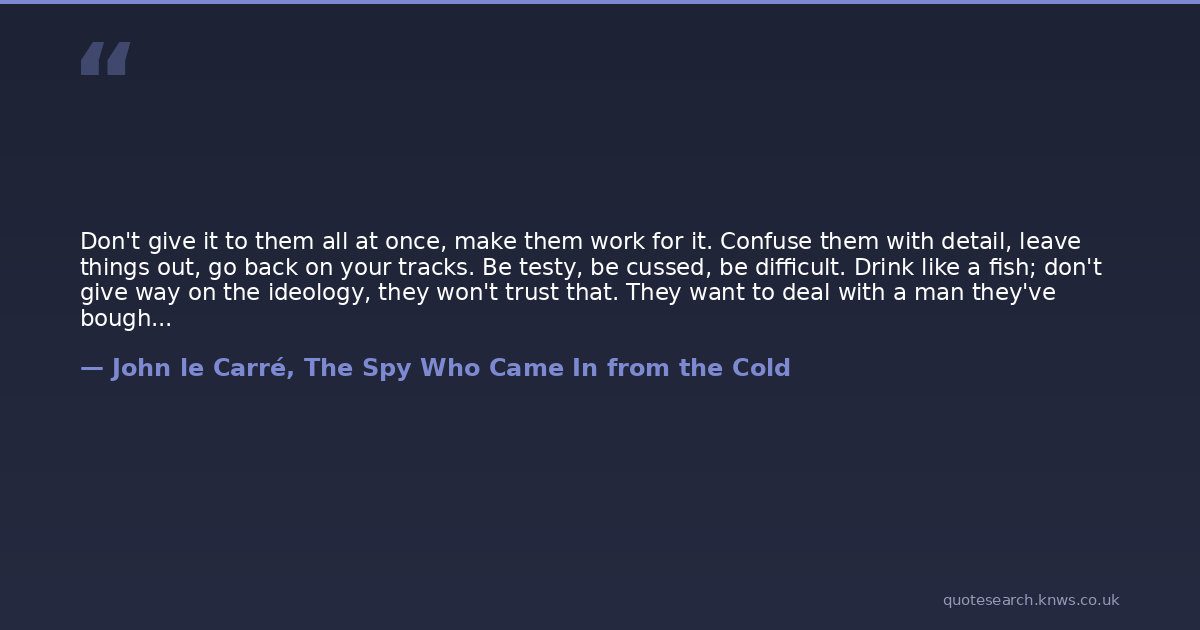 Don't give it to them all at once, make them work for it. Confuse them with detail, leave things out, go back on your tracks. Be testy, be cussed, be difficult. Drink like a fish; don't give way on the ideology, they won't trust that. They want to deal with a man they've bought; they want the clash of opposites, Alec, not some half-cock convert.