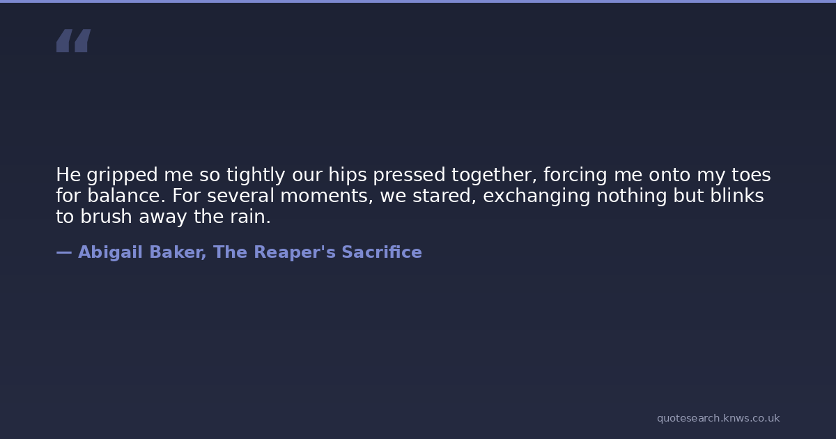 He gripped me so tightly our hips pressed together, forcing me onto my toes for balance. For several moments, we stared, exchanging nothing but blinks to brush away the rain.