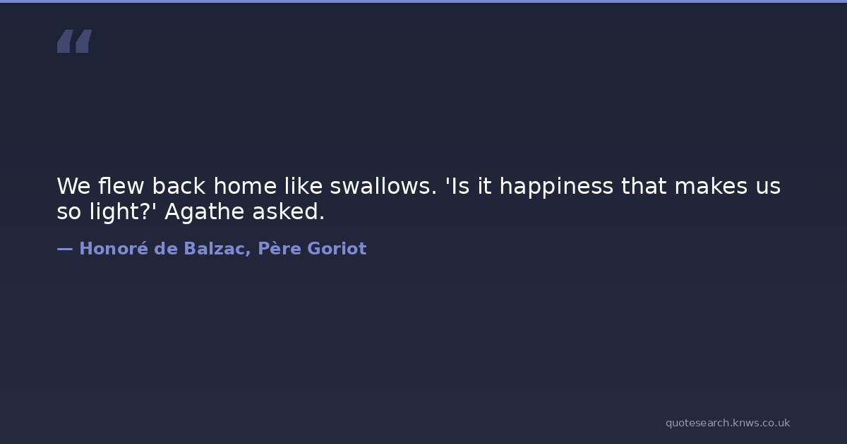 We flew back home like swallows. 'Is it happiness that makes us so light?' Agathe asked. charming pure sweet Download Image Share on X Share on Facebook Copy Link