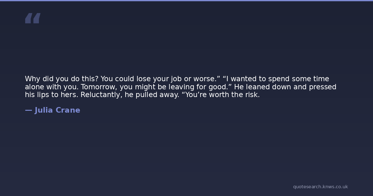Why did you do this? You could lose your job or worse.” “I wanted to spend some time alone with you. Tomorrow, you might be leaving for good.” He leaned down and pressed his lips to hers. Reluctantly, he pulled away. “You’re worth the risk.