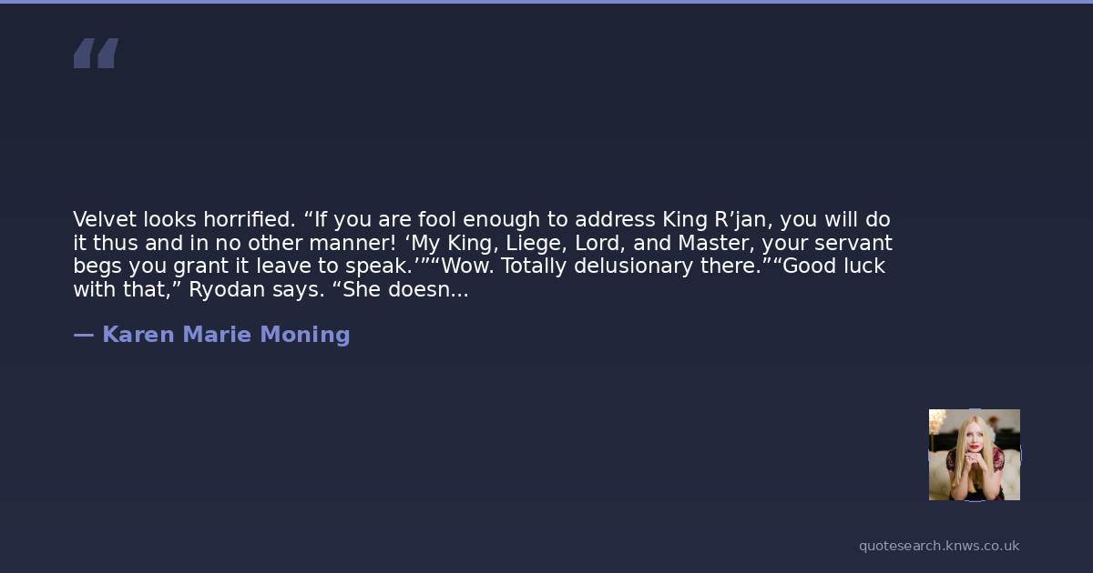 Velvet looks horrified. “If you are fool enough to address King R’jan, you will do it thus and in no other manner! ‘My King, Liege, Lord, and Master, your servant begs you grant it leave to speak.’”“Wow. Totally delusionary there.”“Good luck with that,” Ryodan says. “She doesn't beg to speak, or do anything else. You can lock her up, down, and sideways and it’s never going to happen.”I beam at him. I had no idea he thought so highly of me.