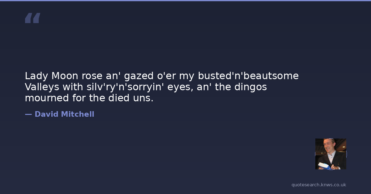 Lady Moon rose an' gazed o'er my busted'n'beautsome Valleys with silv'ry'n'sorryin' eyes, an' the dingos mourned for the died uns.