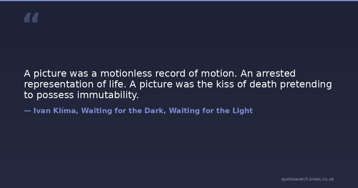 A picture was a motionless record of motion. An arrested representation of life. A picture was the kiss of death pretending to possess immutability.