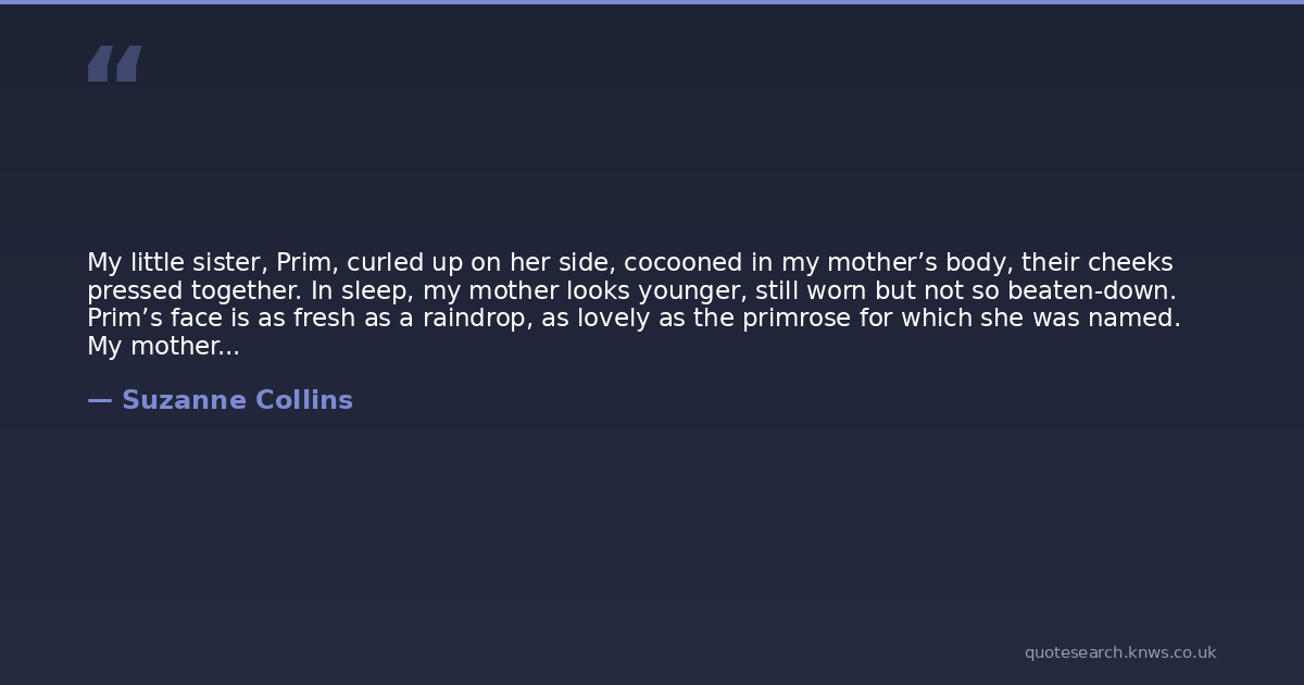 My little sister, Prim, curled up on her side, cocooned in my mother’s body, their cheeks pressed together. In sleep, my mother looks younger, still worn but not so beaten-down. Prim’s face is as fresh as a raindrop, as lovely as the primrose for which she was named. My mother was very beautiful once, too. Or so they tell me.