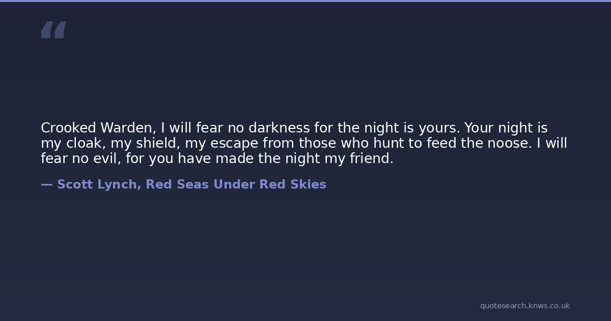Crooked Warden, I will fear no darkness for the night is yours. Your night is my cloak, my shield, my escape from those who hunt to feed the noose. I will fear no evil, for you have made the night my friend.