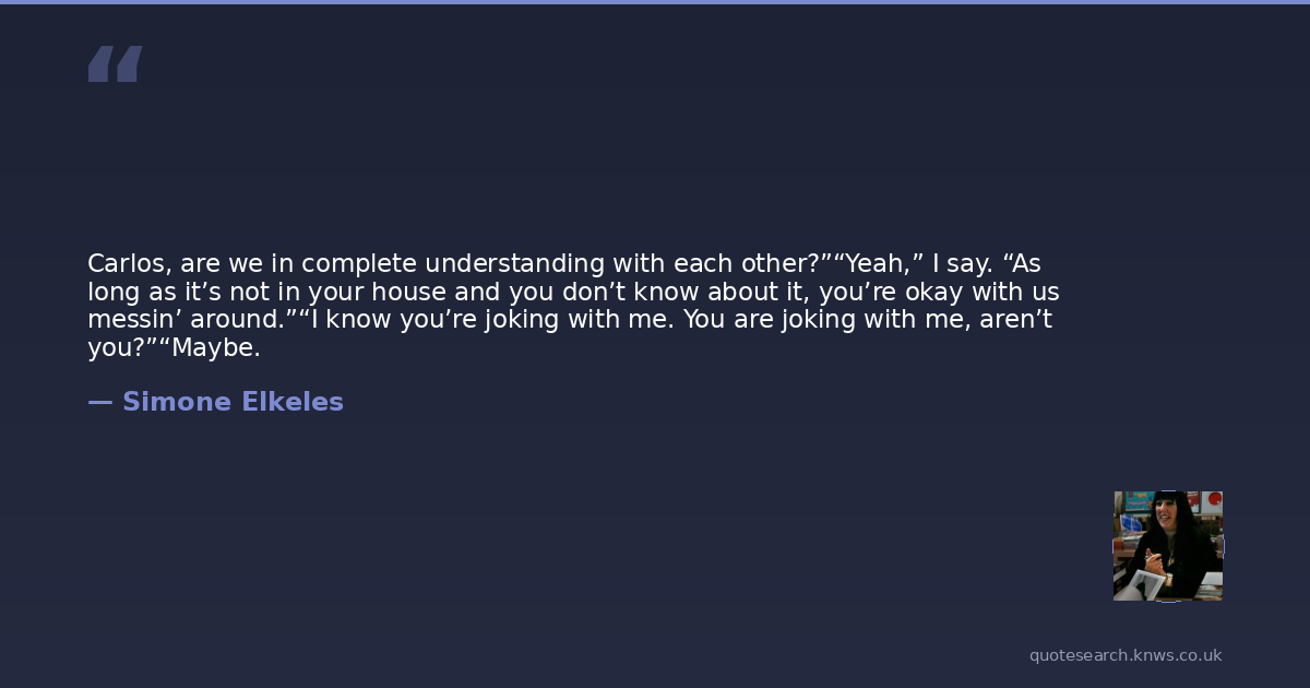 Carlos, are we in complete understanding with each other?”“Yeah,” I say. “As long as it’s not in your house and you don’t know about it, you’re okay with us messin’ around.”“I know you’re joking with me. You are joking with me, aren’t you?”“Maybe.