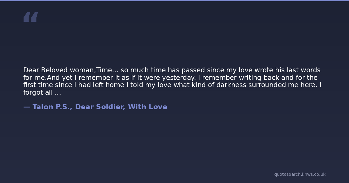 Dear Beloved woman,Time… so much time has passed since my love wrote his last words for me.And yet I remember it as if it were yesterday. I remember writing back and for the first time since I had left home I told my love what kind of darkness surrounded me here. I forgot all the sweet things my father had said to my mother when he was away. I forgot how they got her through all those long and lonely nights.